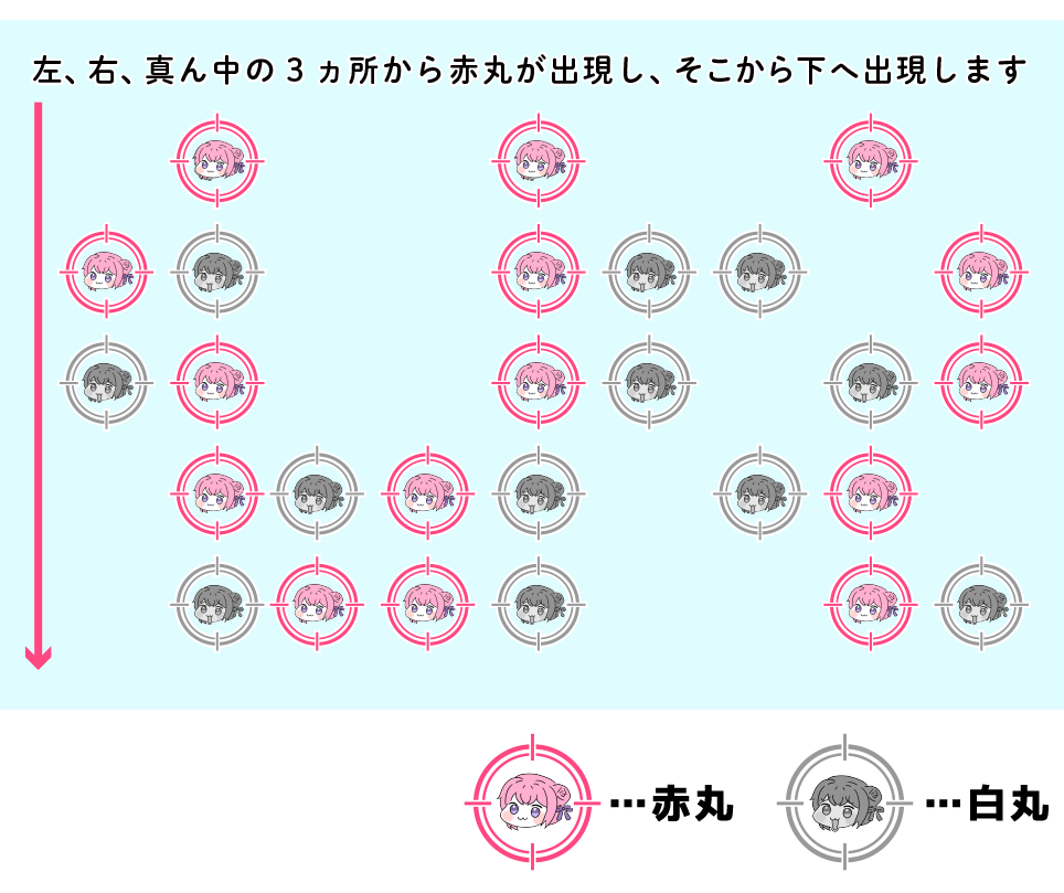今回は3ヵ所から上から下に赤丸が出現する感じです。難易度的には前回より難しいかと思います。
